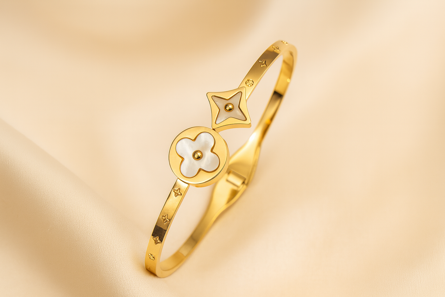 Simply gorgeous clover style bangle. The hinged opening mechanism ensures effortless fastening and removal, combining practical design with refined aesthetics. A timeless piece that transitions seamlessly from everyday wear to special occasions.