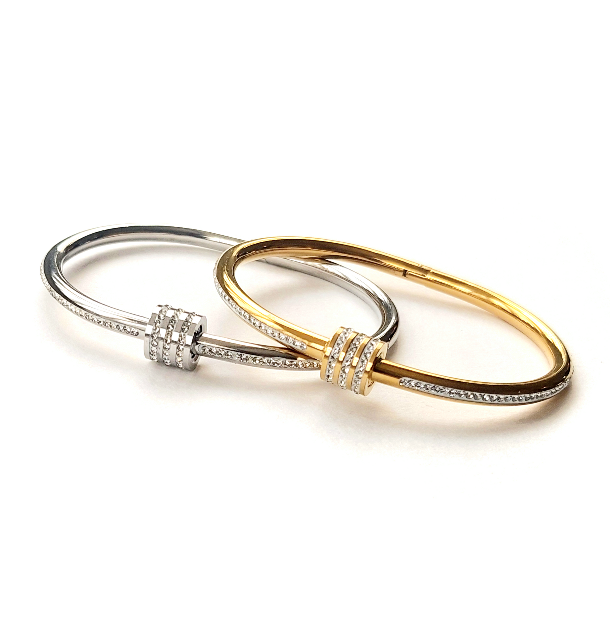 CZ Screw Bangle Set, featuring shimmering cubic zirconias that catch the light beautifully. Designed for a modern, edgy look, these bangles add a touch of sophistication and sparkle. Perfect for layering or wearing alone, they effortlessly enhance your everyday look.