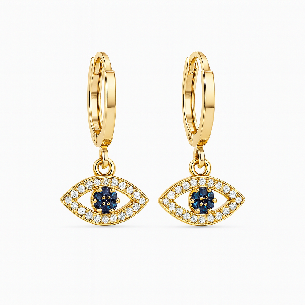 Glamorous evil eye huggie earrings featuring white cubic zirconias forming the eye's outer ring, whilst sapphire-toned stones create the captivating centre—together delivering luminous depth and visual intrigue. The secure huggie silhouette sits comfortably against the earlobe, making these pieces ideal for everyday wear or mixed styling.
