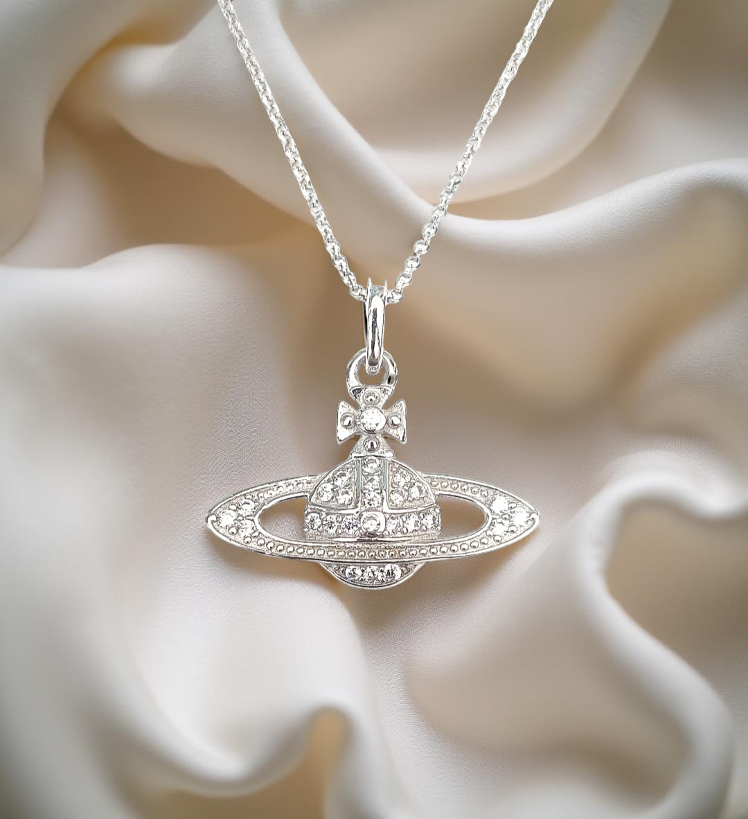 Exquisite planet necklace, meticulously crafted from sterling silver. featuring white brilliant cubic zirconia accents adding a refined sparkle and dimension. Suspended from an 18-inch chain, this piece strikes the perfect balance between statement-making design and everyday wear ability. This necklace delivers timeless appeal with contemporary flair.